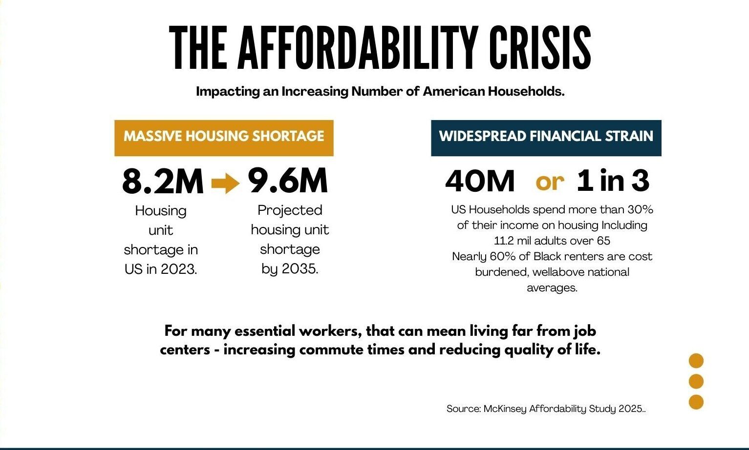 Workforce housing serves essential middle‑income renters—like teachers, nurses, first responders, and service workers as well as seniors —those who fail to qualify for subsidized housing but are cost burdened by market rate rentals and cannot afford the high entry point for single family home ownership. Today, there’s a critical shortage of affordable units for America’s workforce and their families. We focus on bridging the supply-demand imbalance for this ‘missing middle’ by efficiently transforming existing properties in a way that benefits both the community and investors.